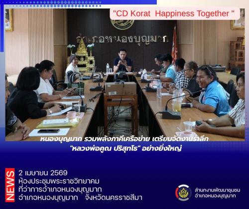นายพงษ์เทพ จันทรนอก นายอำเภอหนองบุญมาก เป็นประธานเปิดการประชุมเตรียมความพร้อมครั้งสำคัญ เพื่อวางแผนจัดงานรำลึกถึง พระเทพวิทยาคม (หลวงพ่อคูณ ปริสุทโธ) อดีตเจ้าอาวาสวัดบ้านไร่ พระเกจิอาจารย์ผู้เป็นที่เลื่อมใสศรัทธาของชาวหนองบุญมากและพุทธศาสนิกชนทั่วโคราช โดยมี นางสาวดาวรุ่ง ตะนุเรือง พัฒนาการอำเภอหนองบุญมาก นำทีม สตรีอาสาพัฒนาชุมชนอำเภอหนองบุญมากจากทุกตำบลเข้าร่วมประชุม เพื่อเตรียมความพร้อมในการจัดกิจกรรม และการอำนวยความสะดวกในด้านต่างๆ เพื่อให้งานรำลึกในปีนี้เป็นไปอย่างสมเกียรติและเปี่ยมด้วยแรงศรัทธา เป็นศูนย์รวมจิตใจของคนในชุมชน และส่งเสริมการท่องเที่ยวเชิงวัฒนธรรมในพื้นที่อำเภอหนองบุญมากอีกด้วย
